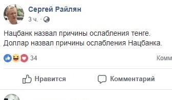 Так же остроумно ситуацию с тенге описал заместитель председателя правления KASE Андрей Цалюк.