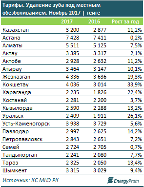 По данным аналитиков, например, удаление зуба под местной анестезией в ноябре стоило в среднем 3 200 тенге, подорожав за год на 11 процентов.