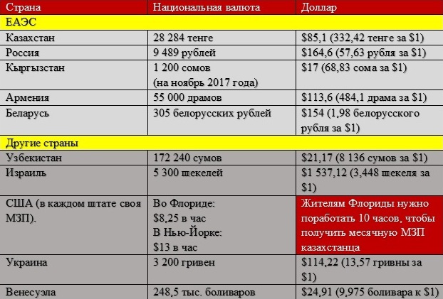 "Меньше получают только в Кыргызстане, где МЗП составляет всего 17 долларов. В ноябре 2017 года в правительстве соседней республики обеспокоились тем, что минимальная заработная плата в стране в четыре-пять раз меньше прожиточного минимума", - говорится в статье.