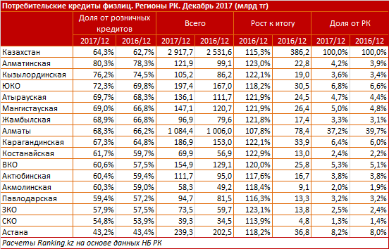 Единственный регион с долей потребкредитов от всех займов физлиц ниже 50 процентов это Астана - 43,2 процента.