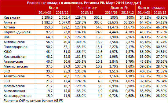 В Казахстане объем депозитов в иностранной валюте за первый квартал 2014 года увеличился на треть и составил 2,2 триллиона тенге, сообщает Ranking.kz.