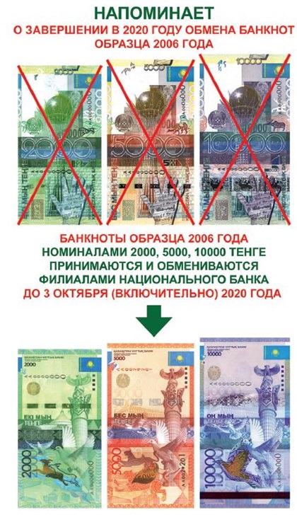 В пресс-службе отметили, что 3 октября 2020 года завершается трехлетний период приема и обмена банкнот номиналов 2000, 5000, 10 000 тенге.
