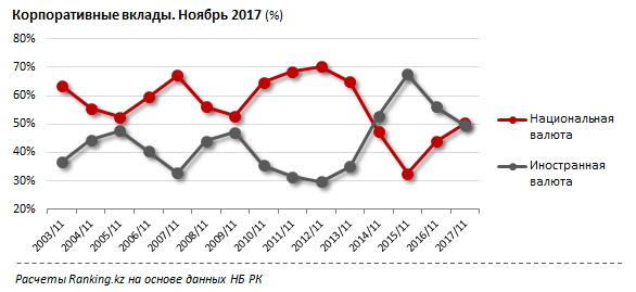 В исследовании отмечается, что после трех лет преобладания в портфеле корпоративных вкладов в инвалютах на конец ноября 2017 года чуть более половины объема депозитов юрлиц пришлось на национальную валюту - 50,4 процента (годом ранее было 43,9 процента).