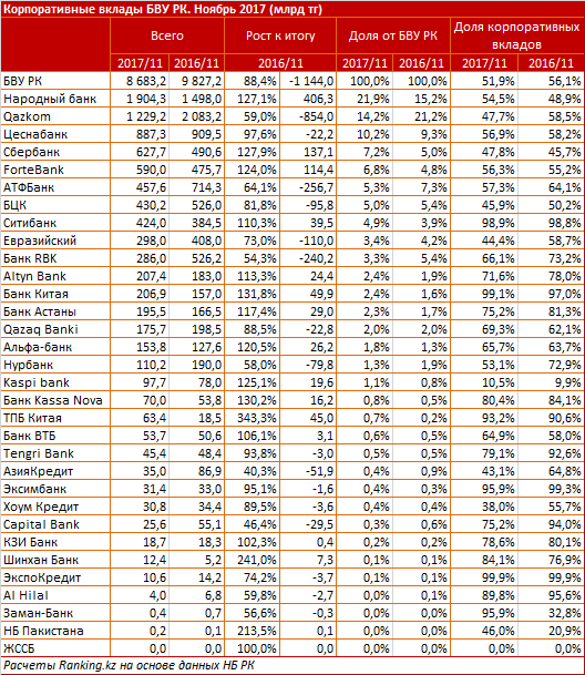 По данным исследования, в целом депозитная база банков после нескольких лет роста уходит в минус: по итогам ноября 2017 года объем уменьшился на 4,5 процента за год (на 790,1 миллиарда тенге), до 16,7 триллиона тенге.