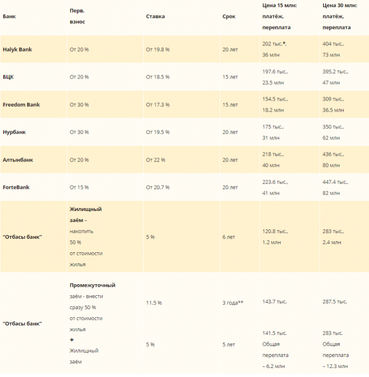 В таблице представлены примеры расчета на покупку жилья стоимостью 15 и 30 миллионов тенге, включая первоначальный взнос. Срок кредитования брали максимальный. Условия – стандартные рыночные, без привязки к зарплатному проекту какого-либо банка.