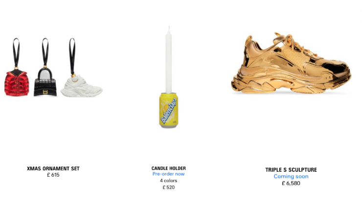 К Новому году представлены и елочные игрушки в виде главных хитов прошлых показов, стоят они 256 000 тенге. Также можно отыскать золотую скульптуру в виде кроссовки Triple S стоимостью в 3,5 миллиона тенге, подсвечники, напоминающие банки от газировки, за 284 000 тенге.