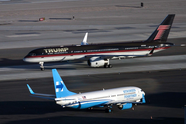 Самолет Трампа - модифицированный Boeing 747-200B стоит один миллиард долларов. Его максимальная скорость 1 000 километров в час, длина - 70 метров. Самолет также называют Air Force One.