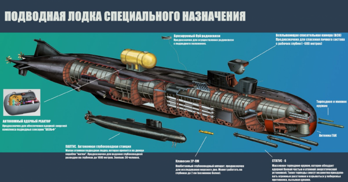 Кроме "Посейдона", субмарина проекта 09852 должна нести и обычные 650-миллиметровые и 533-миллиметровые торпеды.