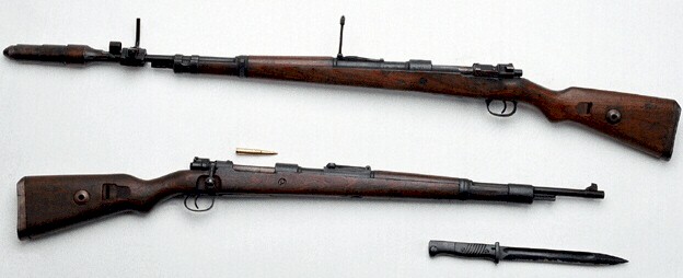 На вооружении фашистских пехотных дивизий, как основных тактических войск, стояли магазинные винтовки со штыками 98 и 98k "Маузер".
