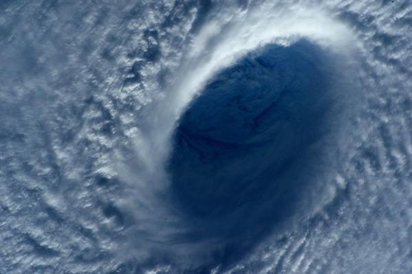 Итальянской астронавтке удалось запечатлеть эпицентр тайфуна - так называемый глаз, окруженный сильнейшими порывами ветра и дождем.