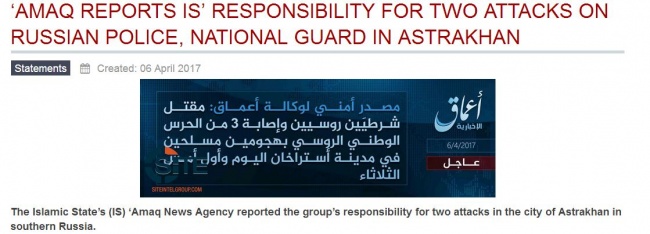 На их портале говорится, что боевики ДАИШ взяли на себя ответственность за убийство двух полицейских, а также устроили стрельбу на посту Росгвардии в Ленинском районе Астрахани.