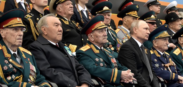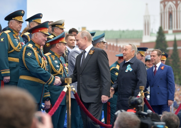 На главную трибуну в Москве Нурсултан Назарбаев вышел вместе с президентом России, верховным главнокомандующим Владимиром Путиным и премьер-министром РФ Дмитрием Медведевым.