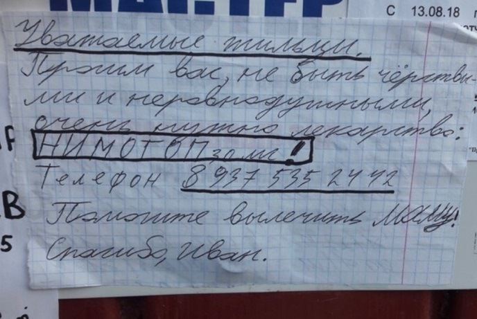 Объявление, которое наклеил волгоградский школьник: "Уважаемые жильцы. Просим вас не быть черствыми и неравнодушными, очень нужно лекарство Нимотоп! Помогите вылечить маму! Спасибо, Иван".