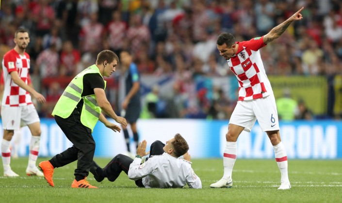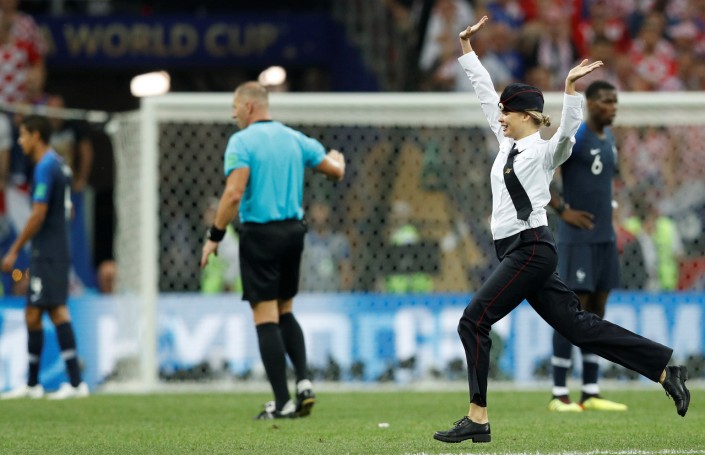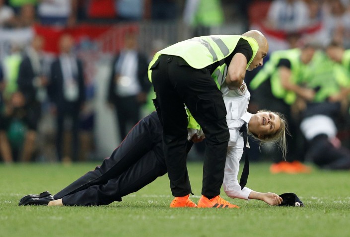 Как позже сообщили российские СМИ, участники Pussy Riot зашли на стадион официально, при помощи Fan ID. С собой они пронесли полицейскую форму. Переодевшись, члены группы прорвались сквозь стюардов и выбежали на поле. Поймать их удалось лишь в центре поля. Уносили их сотрудники безопасности буквально на руках.
