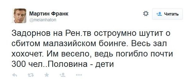 Пользователи социальных сетей активно обсуждают шутку известного российского юмориста Михаила Задорнова о сбитом над Украиной малайзийском Boeing-777, сообщает "Русская служба Би-би-си".