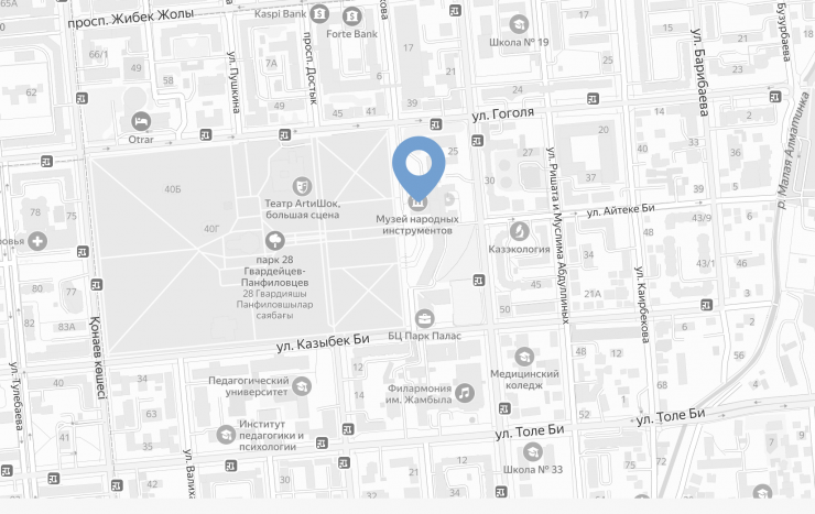 Музей народных музыкальных инструментов имени Ыхласа находится в самом центре Алматы. На его посещение вам потребуется около двух часов. Стоимость билета: 300-500 тенге. Записаться на экскурсию и подробнее узнать о графике работы музея можно здесь.
