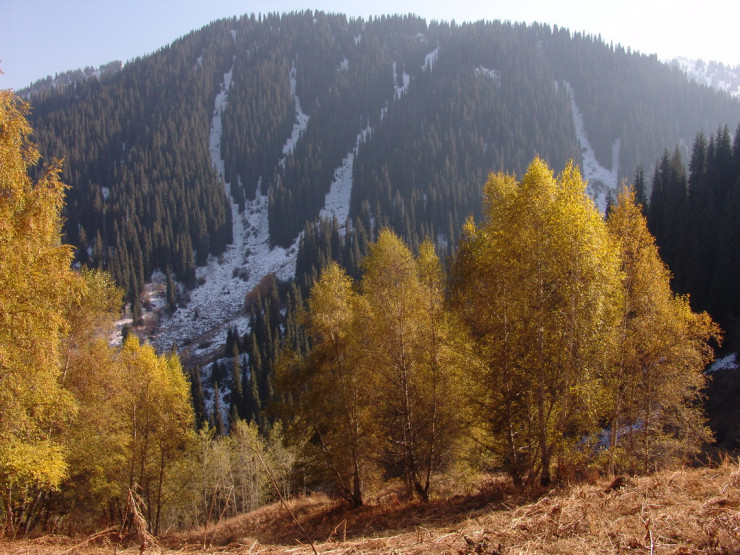 Осенние краски медленно сползают вниз как по холсту, спускаясь все ниже по горным склонам Заилийского Алатау.
