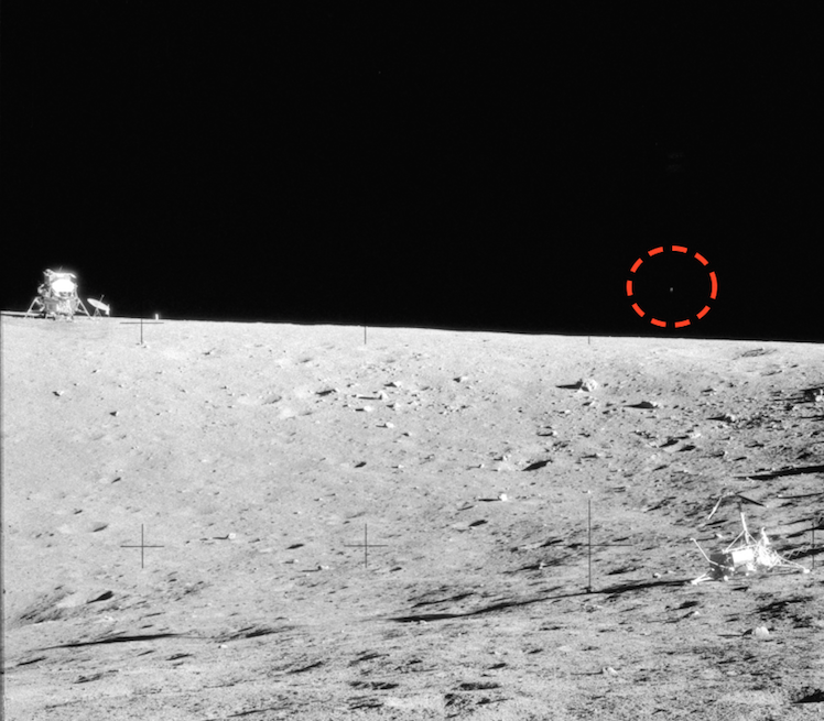 Далее фотография с "Аполлона-12", на которой также виден светящийся объект на черном небе.