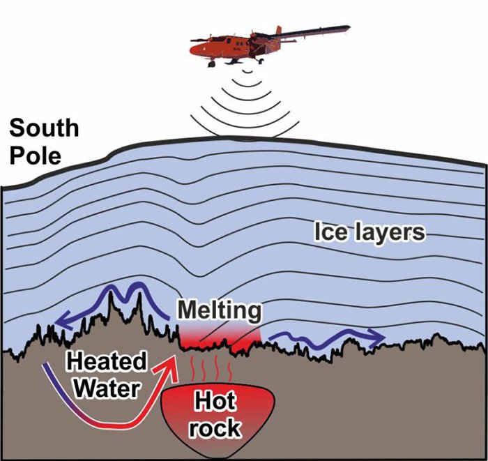 С помощью специального самолета ученые провели радиолокационные исследования, охватив участок с восточной стороны Антарктиды размером 50 на 100 километров. Локатор проник через трехкилометровый ледяной щит и отобразил поверхность земли под ним. Данные показали, что под земной корой существует источник тепла, который плавит лед снизу вверх.