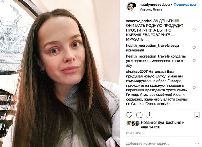 В настоящее время в Сети идет "зачистка", ролики с записью шутки о Карбышеве удаляют, блокируют с формулировкой о нарушении авторских прав. А в Instagram Наталии Медведевой (именно она произнесла злополучные слова о генерале. - Прим.) устроили жесткую травлю актрисы. Люди напоминают исторические факты об убийстве Дмитрия Карбышева и требуют извинений.