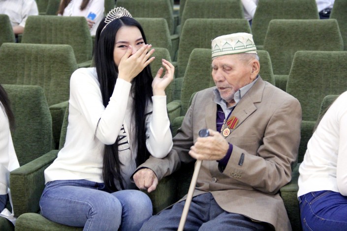 Самая юная участница Балым Женисбеккызы сыграла для пожилых людей на домбре. После этого все вместе исполнили известные военные композиции.