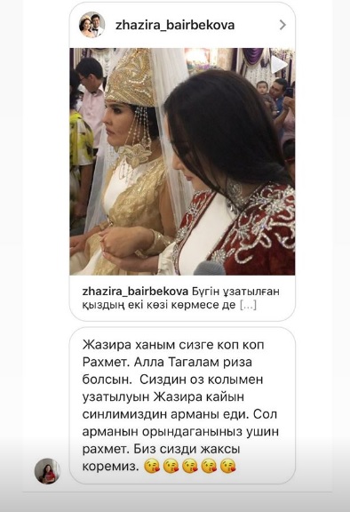 "Қыз бен жігіттің өмірге деген құштарлығына, батылдығына, ақылдылықтарына қарап риза болғаннан қатты толқып кеттім! Шын жүрегімнен аттасым Жазира мен күйеу жігітке бақыт тілеймін!", - дейді әнші.