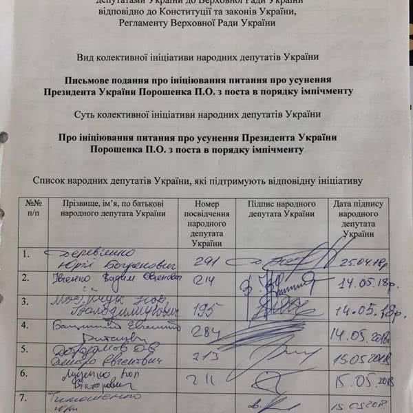 51 депутат Верховной Рады поставил свою подпись под заявлением, которое позволит начать процедуру отстранения от власти президента Украины Петра Порошенко. Об этом в своем Facebook сообщил нардеп Юрий Деревянко.
