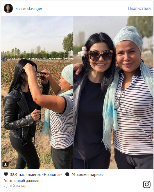 Певица Шахзода приехала в компании фанатов, которые собрали более 50 килограммов хлопка. Об этом она написала на своей страничке в Instagram.