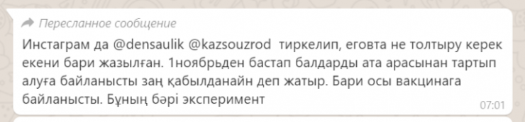 "Ақпарат шындыққа жанаспайды. Мұндай заң жобасы жоқ. Мектептерде балаларды мәжбүрлеп вакцинациялау жүргізілмейді. Мектеп балаларға білім береді, әлеуметтенуге көмектеседі. Ата-аналардың келісімінсіз вакцинациялау туралы мәселе көтеріліп отырған жоқ. Қазақстандықтардан әлеуметтік желілерде резонанс тудыру үшін жеке азаматтар тарататын жалған ақпаратқа сенбеулерін сұраймыз", - деп хабарлады ҚР Білім және ғылым министрлігінің баспасөз хатшысы Мөлдір Әбдуалиева.