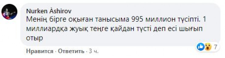 "Менің бірге оқыған танысыма 995 миллион түсіпті. 1 миллиардқа жуық теңге қайдан түсті деп есі шығып отыр".