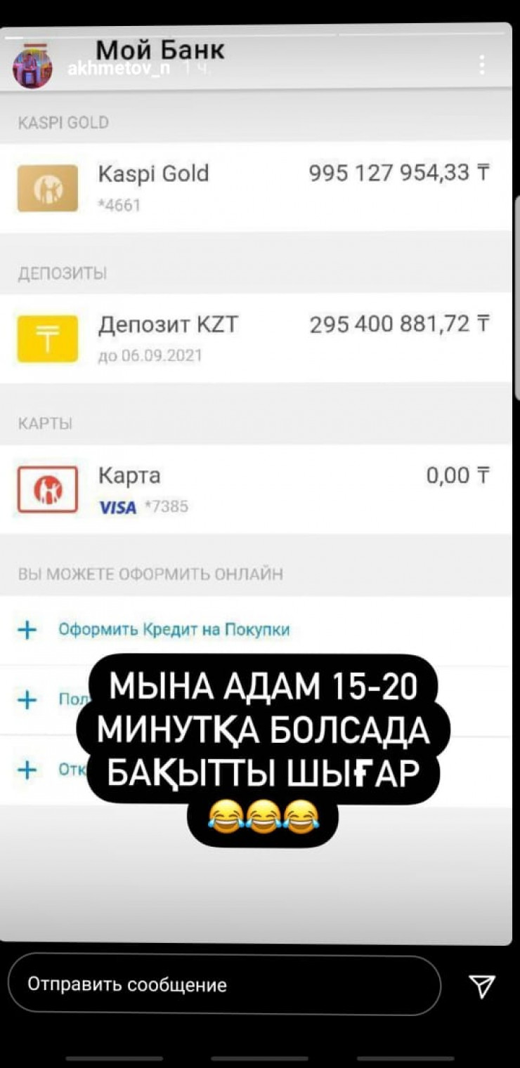 "Менде біраз адамның ақшасы бар еді. Бүгін таңертең беруім керек еді. 460 мыңдай ақша. Каспий банк -31 999 теңге деп көрсетіп тұр".