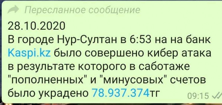 Көп ұзамай желіде мұның бәрі кибершабуыл екені айтылған хабарлама тарады. Онда киберұрылар қазақстандықтардың картасынан 79 миллион теңге тонағаны туралы айтылады.