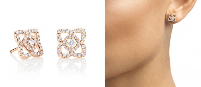 Элегантные серьги из розового золота выполнены в форме безмятежного цветка лотоса. Изысканное сочетание природных бриллиантов и цветочного мотива - воплощение вечности, красоты и чистоты. Для их изготовления ювелиры De Beers использовали 74 бриллианта общим весом 0,33 карата. Класс чистоты бриллиантов G +, класс прозрачности VS +. Размер каждой серьги - 8 на 8 миллиметров.