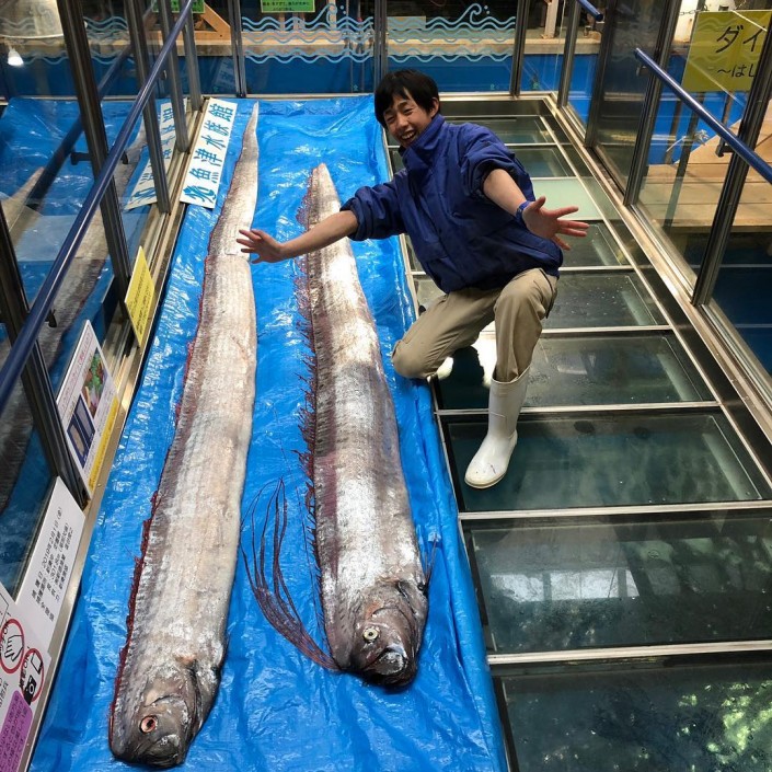 Японские пользователи соцсетей забили тревогу, узнав, что в течение десяти дней сразу три ремнетела ("сельдяных короля") выбросились на берег в префектуре Тояма. Одна из рыбин достигала четырехметровой длины, другая - 3,2 метра.