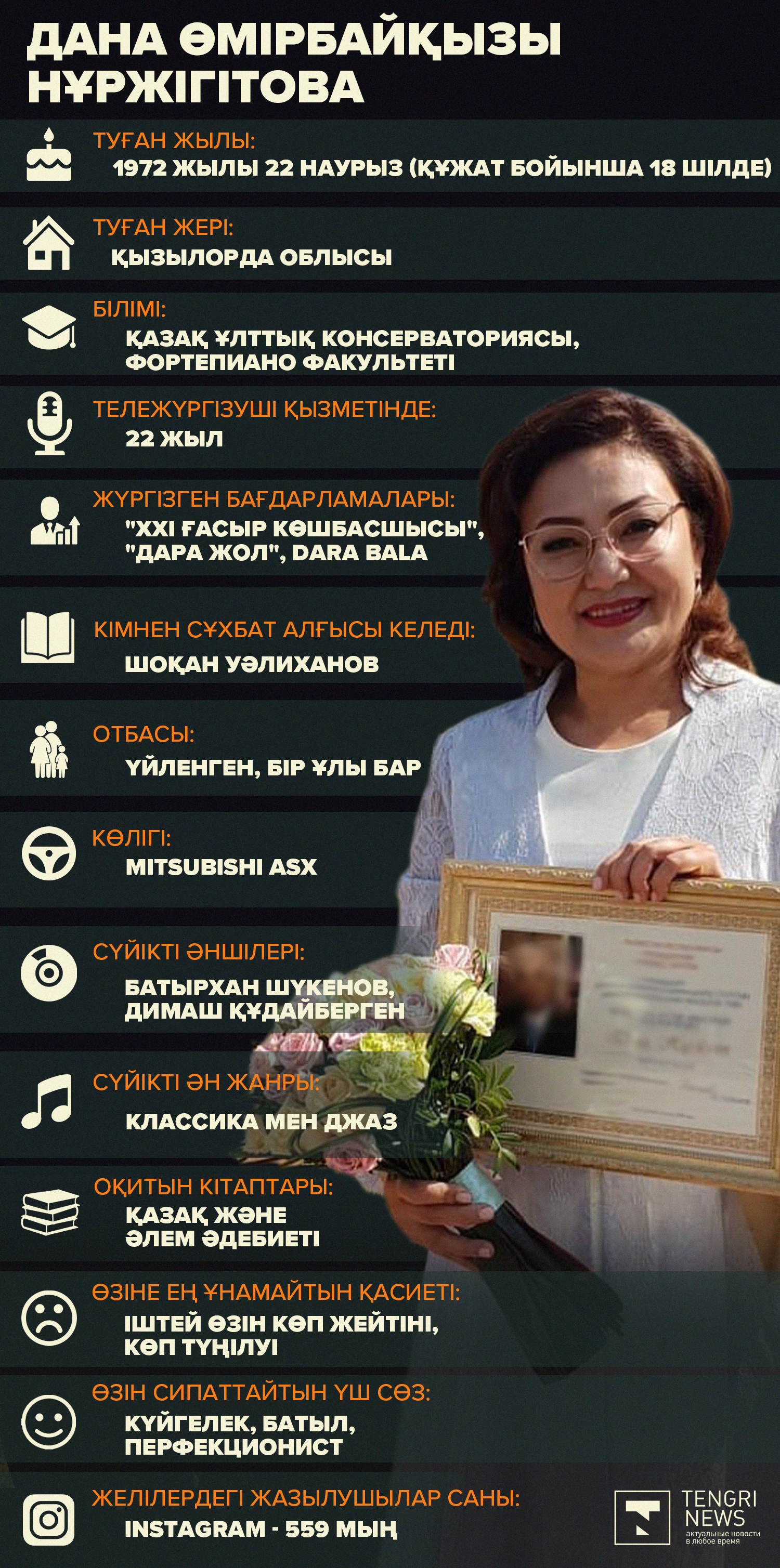 Кеше танымал тележүргізуші Дана Нұржігіт Қазақстан Парламенті Сенатының депутаты болып тағайындалған болатын. Ол қазақстандықтарға 20 жылдан аса уақыт бойы телебағдарламаларды жүргізуімен танылған. Тengrinews.kz тілшісі жаңа сенатор туралы мәліметтер жинап шықты.