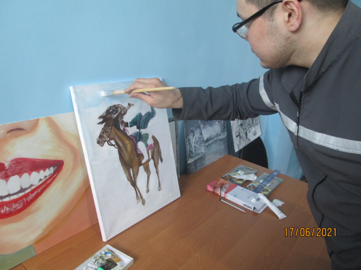 "Прибывая на краткосрочные свидания, отец осужденного приносит холсты и краски вместе с передачей. На данный момент осужденный уже погасил иск на сумму 500 тысяч тенге. Также он обучает и приобщает других осужденных к изобразительному искусству", - сообщил начальник учреждения АК-159/25, подполковник юстиции Улан Кусаинов.