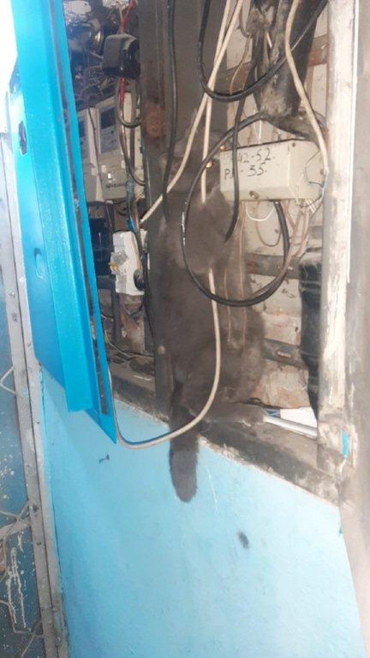 Кот залез в электрощитовую. Сотрудники ДЧС ВКО, прибыв на место "заточения" животного, заметили, что из электрощитовой виден серый, пушистый "комок". Кот запутался в проводах и, испугавшись, не шевелясь, сидел в ловушке. Ситуация была очень опасная, медлить нельзя было ни секунды. Спасатели, надев диэлектрические перчатки, аккуратно извлекли животное.