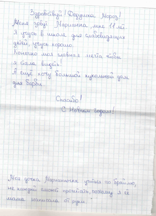 Девочка по имени Марианна мечтает о зрении. Письмо от ее имени написала мама. Девочка учится в школе для слабовидящих детей.