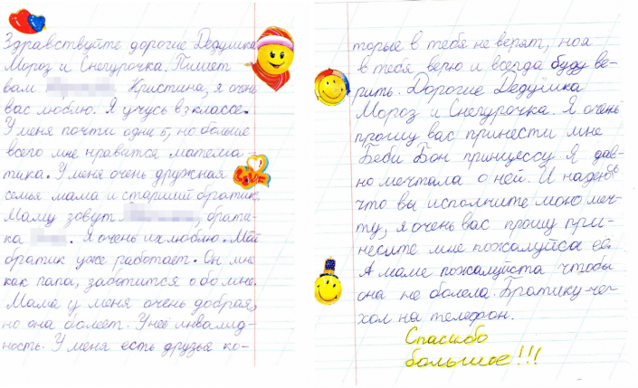 20 декабря завершился прием писем по новогодней акции "Напиши письмо Деду Морозу" от "Казпочты". В этом году было получено более десяти тысяч писем. По данным пресс-службы компании, большинство детей просят Деда Мороза подарить им смартфоны, планшеты и другие новомодные гаджеты. Но есть и письма, где школьники просят в подарок здоровье для мамы, книги или суперсилу. Редакция Tengrinews.kz собрала несколько трогательных посланий Деду Морозу.