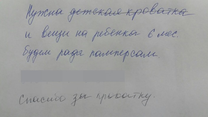 По ее словам, через пару дней куртку принесли в магазин и попросили передать автору объявления. Но к этому времени рядом с первой запиской появилась вторая. "Нужна детская кроватка и вещи на ребенка шести месяцев. Будем рады памперсам".