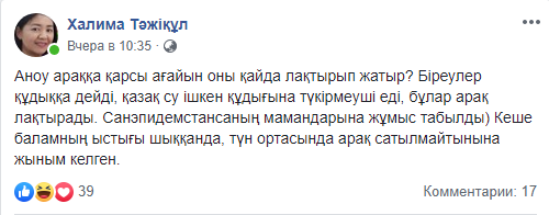 "Аноу араққа қарсы ағайын оны қайда лақтырып жатыр? Біреулер құдыққа дейді, қазақ су ішкен құдығына түкірмеуші еді, бұлар арақ лақтырады. Санэпидемстансаның мамандарына жұмыс табылды, Кеше баламның ыстығы шыққанда, түн ортасында арақ сатылмайтынына жыным келген", - дейді ол Facebook-парақшасында.