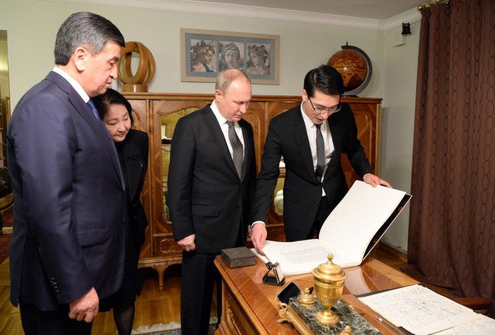 28 марта президент России Владимир Путин совершил визит в Кыргызстан, в рамках которого вместе со своим кыргызским коллегой Сооронбаем Жээнбековым посетил дом-музей писателя Чингиза Айтматова в Бишкеке, пишет АКИpress.