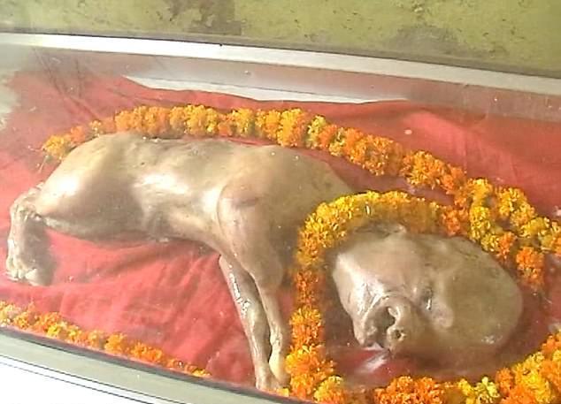Религиозные последователи поместили тело теленка в специальный саркофаг и оборудовали импровизированный алтарь. Со всей Индии люди едут, чтобы увидеть необычное животное, возложить к нему гирлянды цветов и подарки, как к божеству.