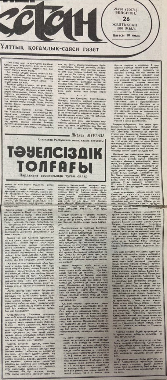 Бұл - "Егеменді Қазақстан" газетінде Шерхан Мұртазаның Парламент сессиясында туған ойлары жайлы мақаласы, 1991 жыл 26 желтоқсан.
