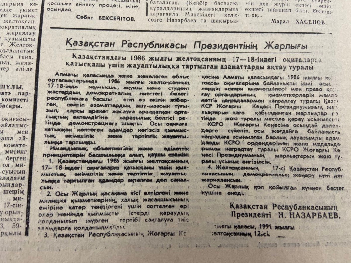 Бұл - Елбасы Нұрсұлтан Назарбаевтың 1986 жылы 17-18 желтоқсандағы оқиғаларға қатысқаны үшін жауаптылыққа тартылған азаматтарды ақтау туралы жарлығы.