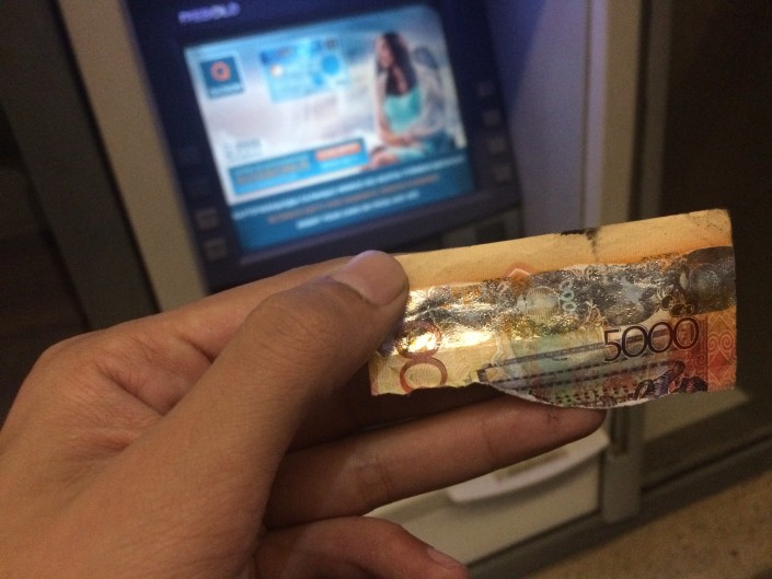 Как пояснил автор публикации, он снял через банкомат небольшую сумму денег, вместе с которыми аппарат выдал порванный кусок денег. "Самое интересное, что нашелся человек, которому досталась другая половина купюры. Он написал мне в Facebook. На следующий день мы с ним встретились, и я сверил разрезы, которые сходились. В тот день он тоже обслуживался в том же банкомате. Но, когда хотел взять деньги, аппарат прищемил деньги. Когда он потянул посильнее, пятитысячная купюра порвалась. После нашей встречи он пошел в отделение банка, где ему поменяли испорченную банкноту" - подытожил Галымурат Жукел.