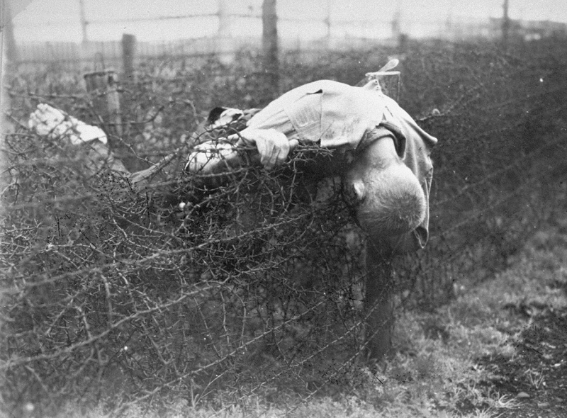 Труп узника концлагеря Лейпциг-Текла на колючей проволоке.