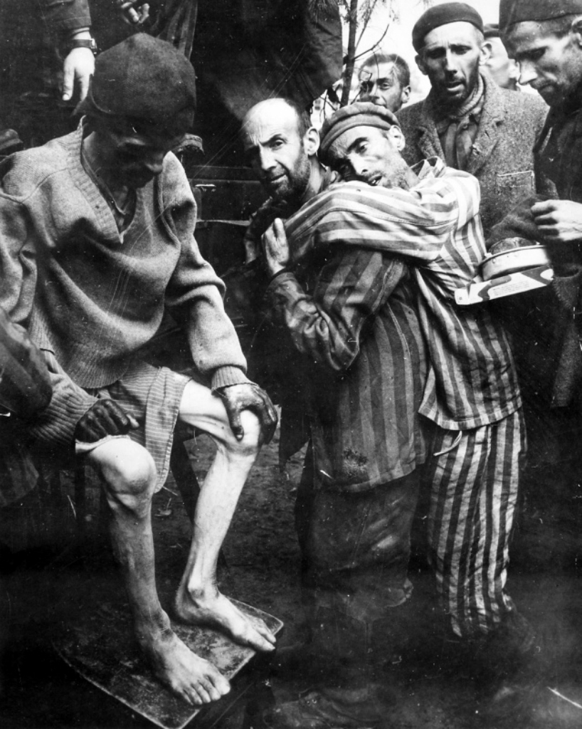 Заключенные концентрационного лагеря смерти Флоссенбург (Flossenburg) после освобождения 97-й пехотной дивизией армии США в мае 1945 года. Изможденный заключенный в центре - 23-летний чех - болен дизентерией. Лагерь Флоссенбург находился в Баварии возле одноименного города на границе с Чехией. Был создан в мае 1938 года. За время существования лагеря через него прошли около 96 тысяч заключенных, из них более 30 тысяч скончались в лагере.