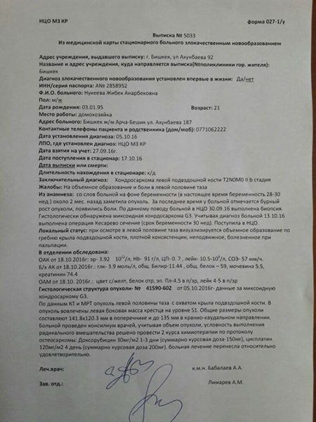 "Дорогой мой Ангел! Меня зовут Жибек. Мне 21 год. Я мама чудесного четырехмесячного малыша Имана. Мы живем в городе Бишкек в Кыргызской Республике. Я пишу это письмо с просьбой о помощи. Рождество и новый год время надежды, мечтаний и чудес. Моя история коротка, время играет не в мою пользу. Все началось в сентябре 2016 года, когда обычный прием у врача будучи на 7 месяце беременности превратился в кошмар. Мне поставили диагноз хондросаркома тазобедренной кости третьей степени.
