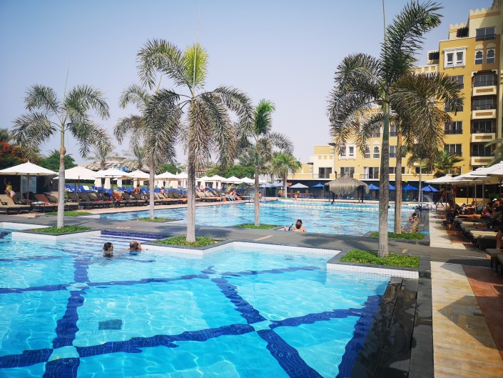 После прибытия в Шарджу автобус довозит туристов до отеля. В этом путешествии, организованном департаментом по развитию туризма эмирата Рас-эль-Хайма, нашим домом стал отель Rixos Bab Al Bahr, который расположился в начале специально построенной морской косы на берегу Персидского залива.